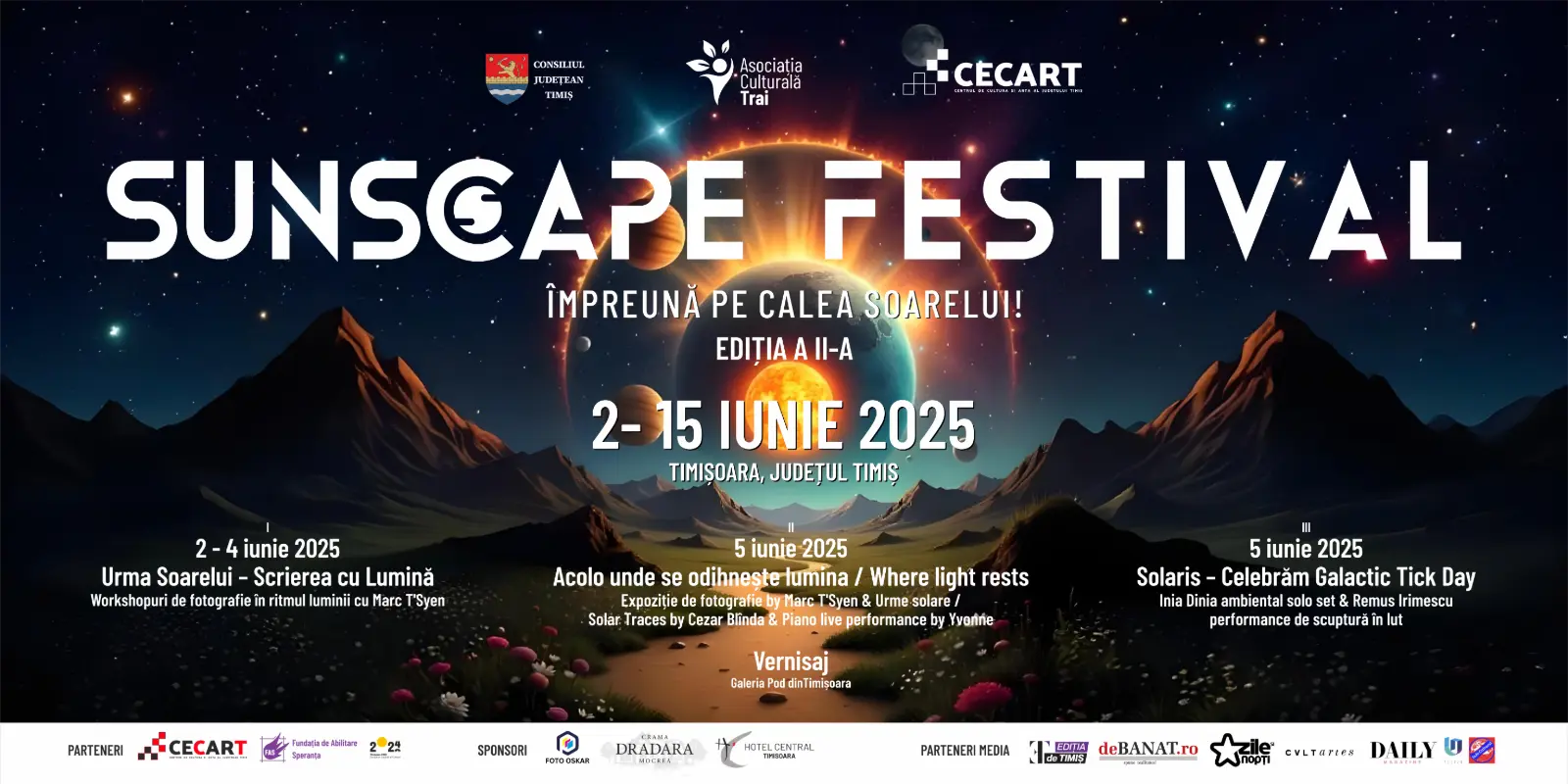 În perioada 2 – 15 iunie, cetatea Timișoarei va fi din nou atinsă de aripa luminii – festivalul Sunscape revine cu cea de-a doua ediție, un eveniment care îmbină arta, educația și vibrația cosmică într-o celebrare multisenzorială a soarelui și a expresiei umane.